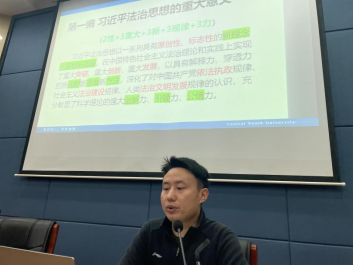 《习近平法治思想概论》课程主要负责老师张新平副教授对课程的体系结构、主要内容、教学目标及考核评定进行了详细的介绍,并表示在教学过程中要坚持正确的政治方向、学术导向、价值取向,忠于习总书记的原著、原文、原意,注重学理化阐释、学术化表达、体系化构建,坚持马工程教材的国家标准,遵循法学人才培养规律。张教授对如何更好地讲授《习近平法治思想概论》课程提出了具体设想和计划。