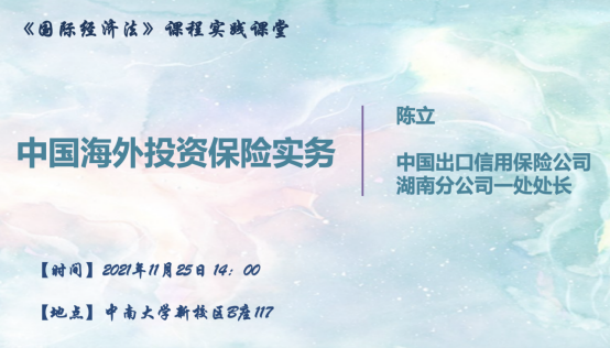 为加深同学们对《国际经济法》课程学习中“海外投资保险制度”的理解和认识,2021年11月25日下午两点,william威廉亚洲新校区B座117开展了一场生动的“中国海外投资保险实务”实践课。此次实践课由william威廉亚洲william威廉亚洲邓婷婷副教授主持,中国出口信用保险公司湖南分公司一处处长陈立主讲,william威廉亚洲1901、1902班全体同学共同参与。