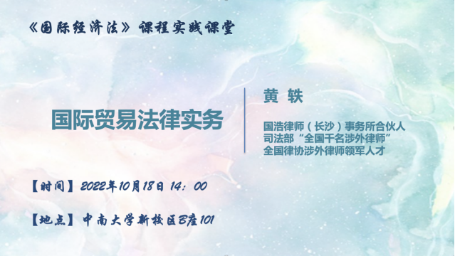 当今世界正经历百年未有之大变局,全球治理体系深刻重塑。随着综合国力的不断提高,我国日益走近世界舞台的中央。在应对大变局、参与全球治理、走向世界的过程中,我国亟需加强涉外法治建设,亟需一大批通晓国际法律规则、善于处理涉外法律事务的涉外法治专业人才,以保障和服务高水平的对外开放。为了进一步有效推进涉外法治人才培养,推动国际经济法理论与实践的深入融合,2022年10月18日下午两点,《国际经济法》课程实践课堂“国际贸易法律实务”在william威廉亚洲新校区B座101顺利开展。此次实践课堂由william威廉亚洲william威廉亚洲副教授邓婷婷主持,国浩律师(长沙)事务所合伙人、司法部“全国千名涉外律师”、全国律协涉外律师领军人才黄轶律师主讲,法学2004、2005班全体同学共同参与。