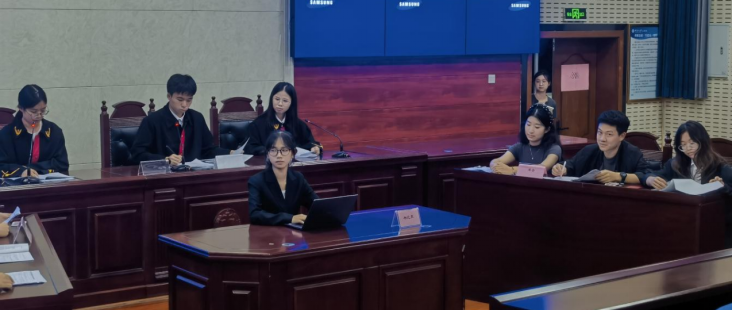 等到第一组的同学展示完成,时针已经指向了8点。第一组同学珠玉在前,他们默契的配合与精彩的演绎更是增添了我们组同学的压力。“…准许参加诉讼,现在开庭!”法槌敲落,庄严神圣的审判正式拉开序幕。面对法庭,原告方居于法庭右侧,被告方居于法庭左侧,而两位审判员与审判长位于法庭正中央,象征着法官的中立立场与司法公正。
