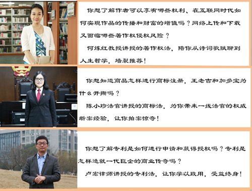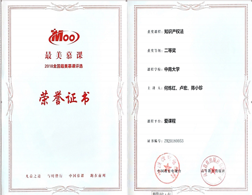 2018年2月《知识产权法》课程在中国大学mooc平台首次上线至今,已经开课7次,参与学习人数累计达三万五千余人次。课程于2018年11月在“首届中国大学慕课精彩100评选展播活动”中脱颖而出,荣获中国“最美慕课”。