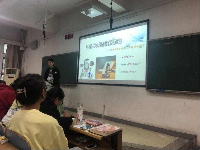 2107班的陈逸佳同学从泸州遗赠继承案看法律原则和法律规则的适用,首先通过对案件案情以及对法院一审、二审中法官的裁判方式的梳理,她指出对该案件裁判结果出现两种声音。一种声音是赞同法院的判决,而另一种是对法官的判决存在争议,并分别具体论述两种观点。其次,陈逸佳介绍了两个与“泸州遗赠继承案”类似的案件,详细阐述了法律原则与法律规则的冲突和法官的自由裁量权。最后,陈逸佳认为善良的心是最好的法律,人类受制于法律,法律受制于情理。