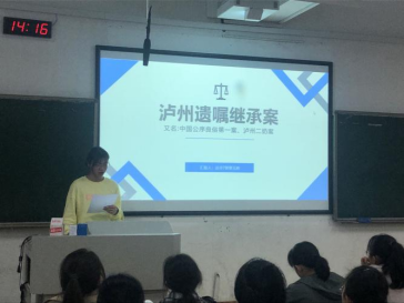 2108班的卢文垚同学浅谈了“泸州遗嘱继承案”,她探讨了本案的遗赠的协议是否有效以及“帕尔默继承案”,指出当事人的行为违法了法律规定和原则,违背了任何人不能从过错中受益的原则。她认为本案适用法律原则的原因是为了实现个案正义,舍弃了法律规则,充分体现了法律和道德关系。