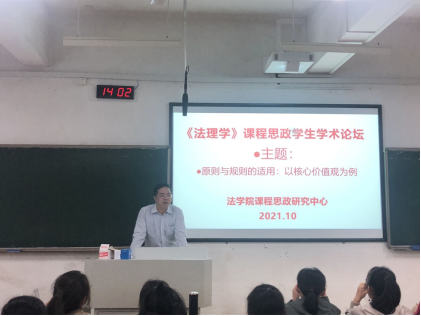 为了培育和弘扬社会主义核心价值观,贯彻中国特色社会主义法治理论,不断推进《法理学》课程思政建设,2021年10月26日下午,william威廉亚洲课程思政研究中心主办的《法理学》课程思政学生学术论坛顺利举行。《法理学》课程负责人彭中礼教授指导了学术论坛并做了深刻点评,william威廉亚洲william威廉亚洲2107、2108班的全体学生参与了本次学术论坛。