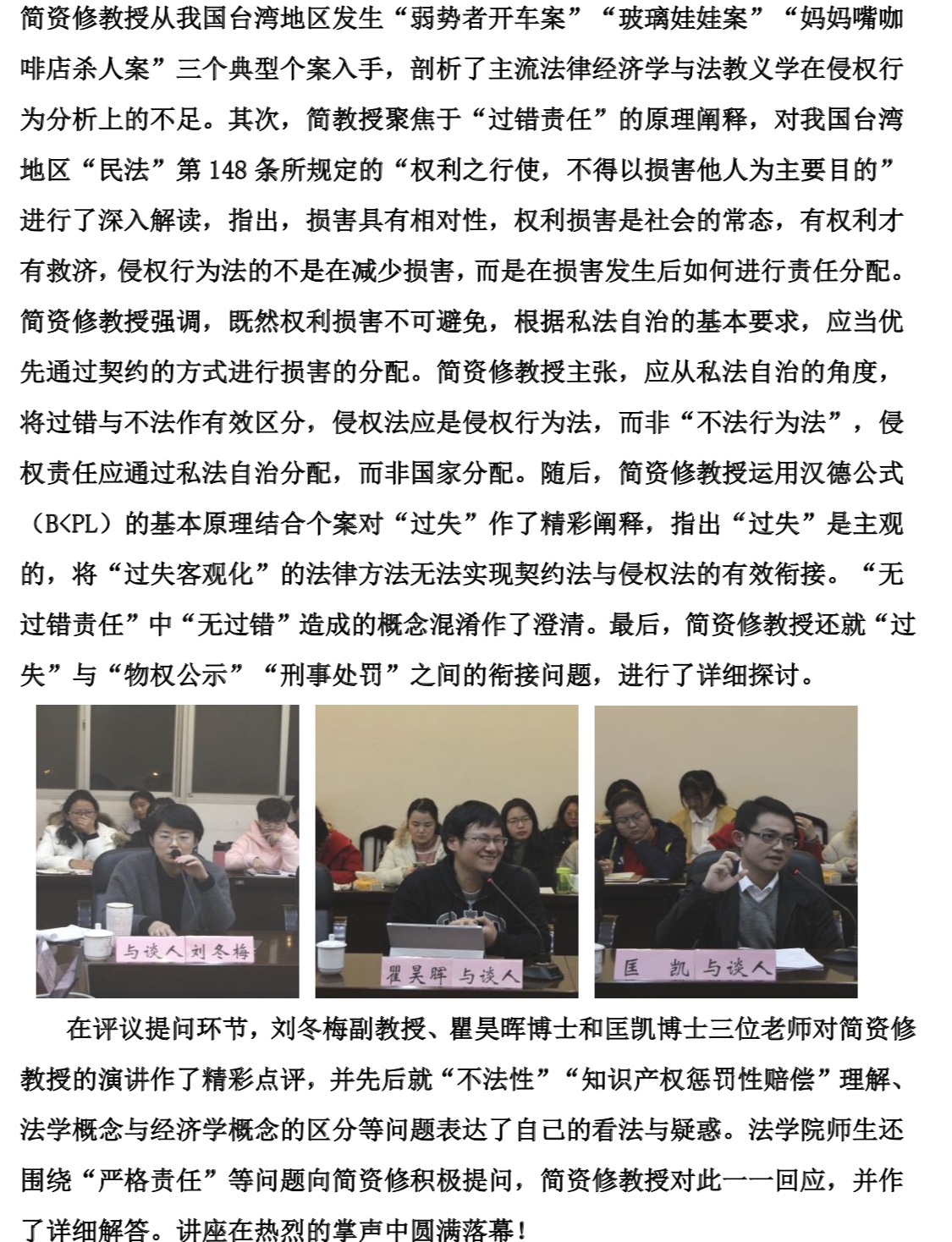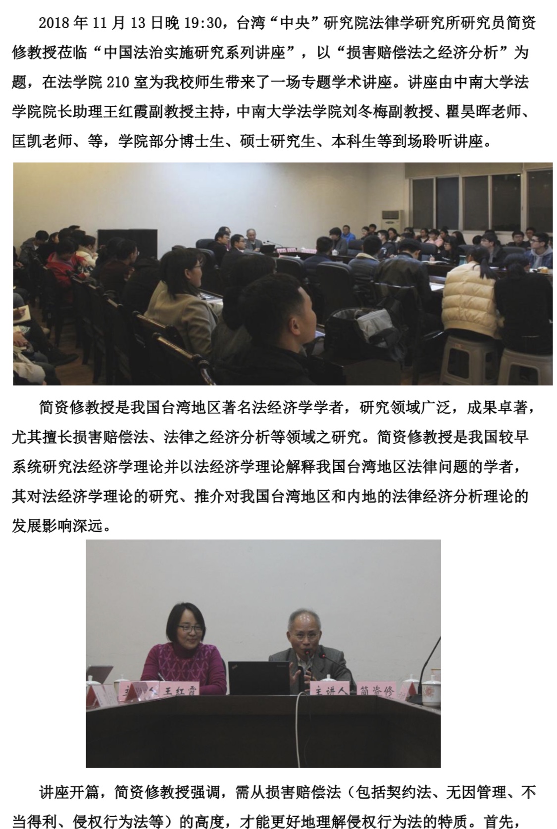 简资修教授做客中南 畅谈“损害赔偿法之经济分析”