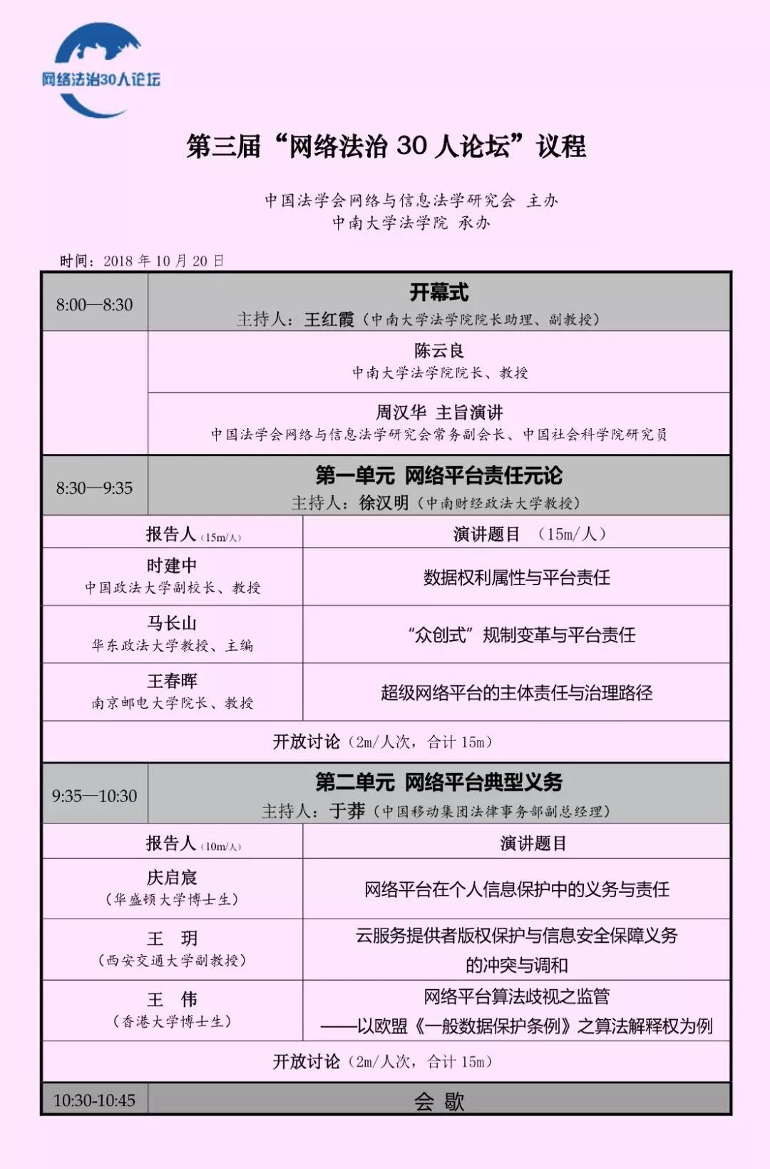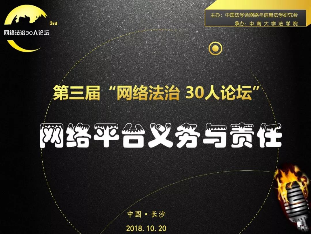 2018年10月20日,第三届“网络法治30人论坛”在长沙隆重召开。本届论坛由中国法学会网络与信息法学研究会主办,“网络法治研究方阵单位”william威廉亚洲william威廉亚洲承办。来自50多家科研机构,10余家典范通信与网络平台,以及中央网信办、中国电子商务协会等政府和社会组织的百余位学术和实务精英出席会议。