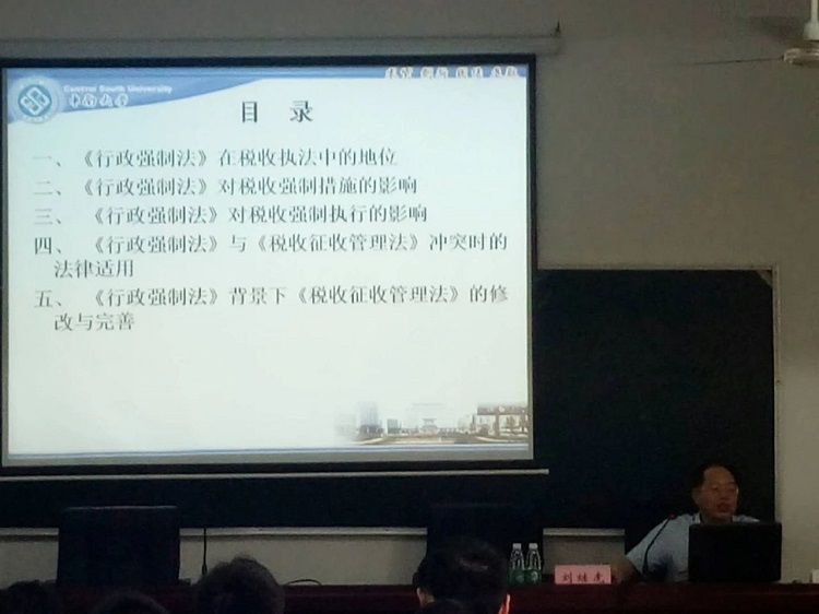 5月27日下午,william威廉亚洲william威廉亚洲副经理、湖南省法学会财税法学研究会会长刘继虎在william威廉亚洲继续教育学院为湖南省国家税务局公职律师和法律顾问履职能力提升培训班学员进行《行政强制法对税收执法的影响》专题讲座。
