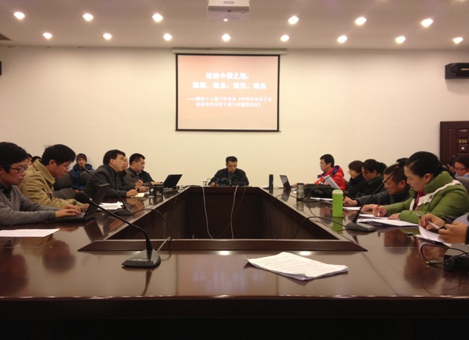 本次讲谈的主题是“法治中国之道:理想、理念、理性、理由——解读十八届三中全会《中共中央关于全面深化改革若干重大问题的决定》”。陈云良教授作了“花非花、雾非雾——正视中国社会结构的变化”基调发言,陈教授提出了中国社会结构的五重变迁这一富有见地的观点,并据此分析了我国法制建设的种种悖论,为科学立法、严格执法、公正司法提供了指导性意见。胡平仁教授则从协商不平等的前提出发,对协商民主的建设提出了令人耳目一新的观点。蒋海松博士从人权司法保障的角度诠释了《决定》的意义。唐东楚副教授则对社会诚信的维度和体系进行了考察和归纳。王进文博士、徐靖博士从现代治理方式转型的角度对法治政党和法治政府建设提出了独到的见解。龙兴盛教授、金大宝博士、陈立洋博士生则围绕司法体制改革问题进行了解读和反思。张宝博士从美丽中国的背景出发,论证了法治中国视域下环境国家建设的方向。杨清望副教授对党的十一届三中全会以来各次会议文件进行了文本考察,做了“法治中国的萌芽、寄生与反哺”的简短发言。本科生程能同学也做了题为“二次社会转型与农村留守儿童的权利保护”的激昂而颇有深度的发言。部分临时不能与会的老师也提交了书面研讨稿件。