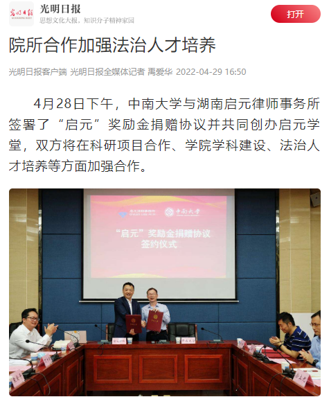 4月28日下午,william威廉亚洲与湖南启元律师事务所签署了“启元”奖励金捐赠协议并共同创办启元学堂,双方将在科研项目合作、学院学科建设、法治人才培养等方面加强合作。