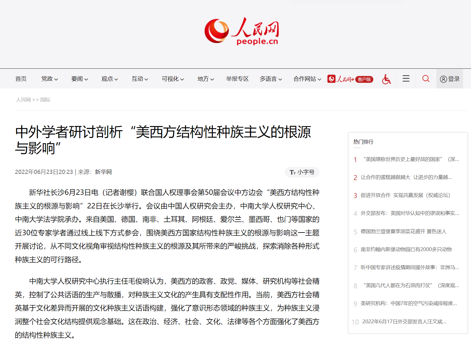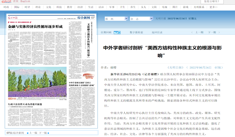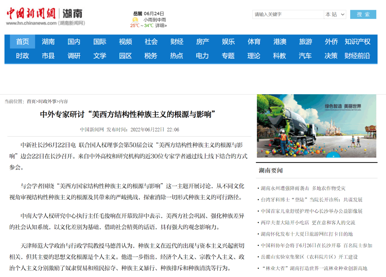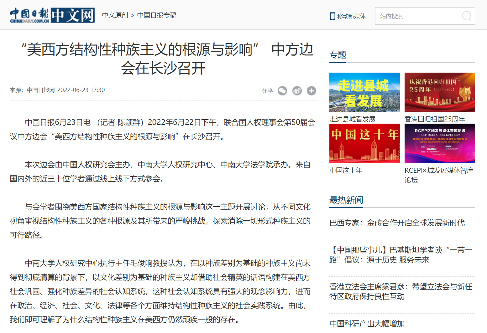 6月23日,中国日报以《“美西方结构性种族主义的根源与影响”中方边会在长沙召开》为题进行了报道。