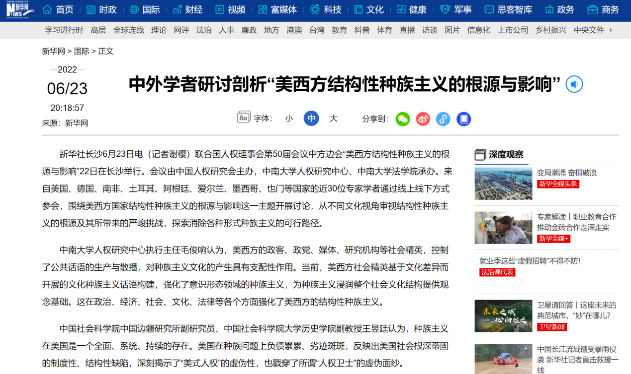 6月22日晚,中国新闻社以《中外专家研讨“美西方结构性种族主义的根源与影响”》为题对边会内容进行了深度报道。