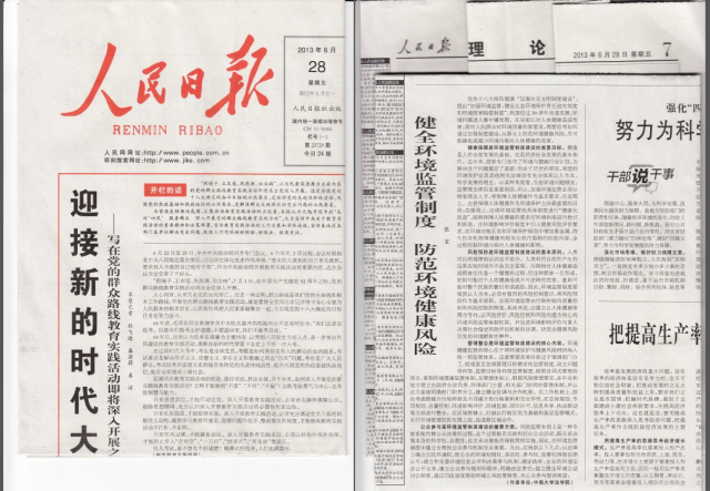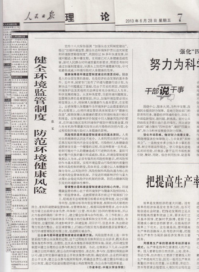 2013年6月28日,《人民日报》理论版(第7版)刊发了我院青年教师张宝的署名文章《健全环境监管制度 防范环境健康风险》。文章指出,我国经过30多年快速发展,环境问题进入集中爆发期,在局部已对人体健康造成危害,需要思考如何通过加强制度建设从源头上防范环境健康风险,尽可能避免或减少环境污染对人体健康的危害。为此,应从四个方面加强环境监管的制度建设:一是确立人体健康保障中心地位,二是贯穿风险预防原则,三是实行管理整合,四是推动公众参与。