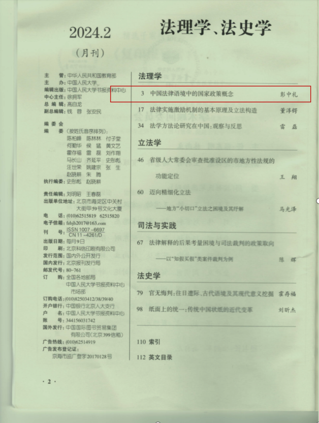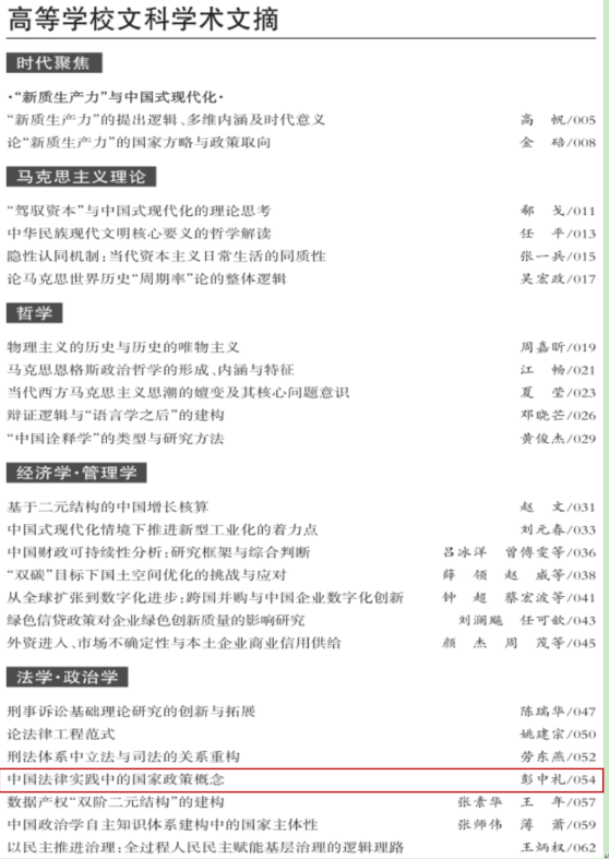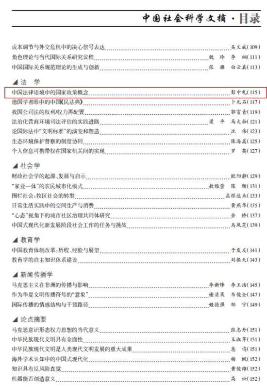 彭中礼教授在《法学研究》2023年第6期发表《中国法律语境中的国家政策概念》一文。该文章发表后在学界中产生了一定影响,分别被三大文摘转载:人大复印资料《法理学 法史学》2024年第2期全文转载,《中国社会科学文摘》2024年第3期重点摘编,《高等学校文科学术文摘》2024年第3期重点摘编。