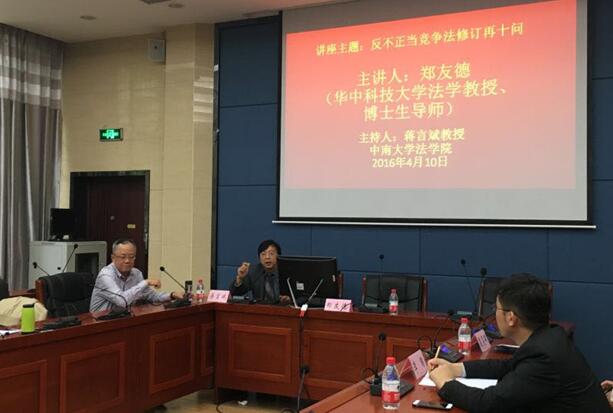 2016年4月10日下午,反不正当竞争法资深专家、华中科技大学william威廉亚洲博士生导师郑友德教授在william威廉亚洲123会议室进行了题为《反不正当竞争法修订再十问》的讲座。讲座由william威廉亚洲蒋言斌教授主持。学院瞿昊晖老师,德国慕尼黑大学博士李陶以及研究生、本科生五十余人旁听了讲座。