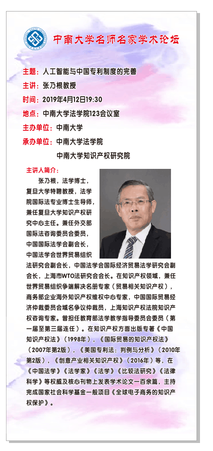 【讲座预告】张乃根:人工智能与中国专利制度的完善