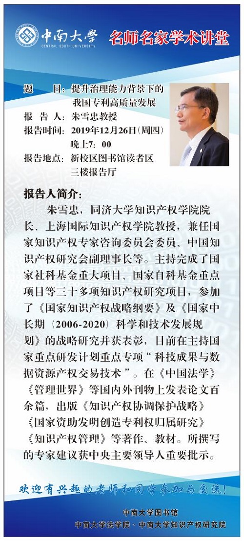 报 告 人:朱雪忠教授(同济大学知识产权学院经理)