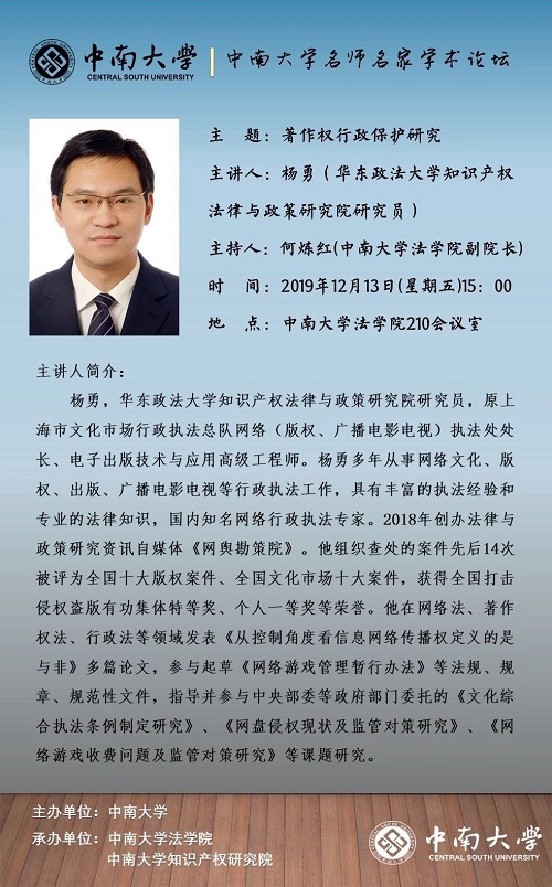 主讲人简介:杨勇,华东政法大学知识产权法律与政策研究院研究员,原上海市文化市场行政执法总队网络(版权、广播电影电视)执法处处长、电子出版技术与应用高级工程师。杨勇多年从事网络文化、版权、出版、广播电影电视等行政执法工作,具有丰富的执法经验和专业的法律知识,国内知名网络行政执法专家。2018年创办法律与政策研究资讯自媒体《网舆勘策院》。他组织查处的案件先后14次被评为全国十大版权案件、全国文化市场十大案件,获得全国打击侵权盗版有功集体特等奖、个人一等奖等荣誉。他在网络法、著作权法·、行政法等领域发表《从控制角度看信息网络传播权定义的是与非》多篇论文,参与起草《网络游戏管理暂行办法》等法规、规章、规范性文件,指导并参与中央部委等政府部门委托的《文化综合执法条例制定研究》、《网盘侵权现状及监管对策研究》、《网络游戏收费问题及监管对策研究》等课题研究。