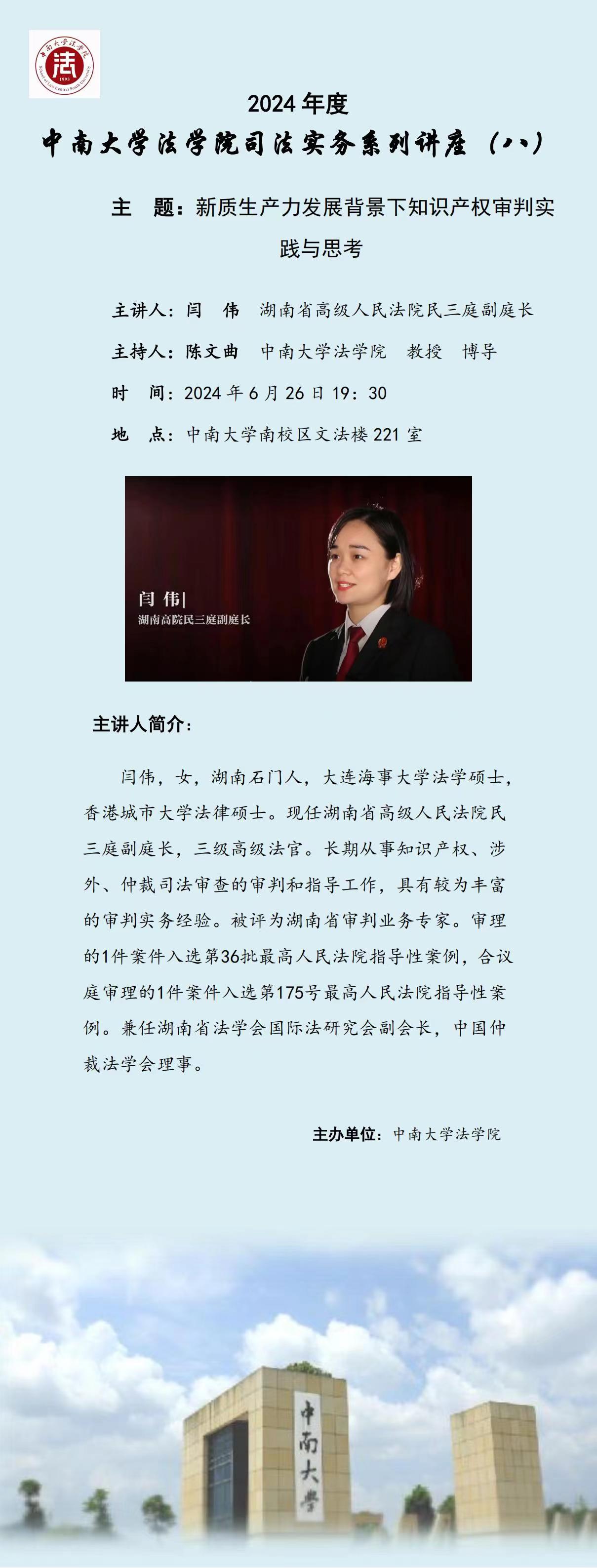 【讲座预告】闫伟:新质生产力发展背景下知识产权审判实践与思考