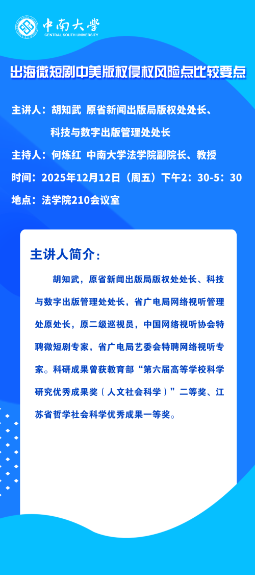 【讲座预告】胡知武:出海微短剧中美版权侵权风险点比较要点