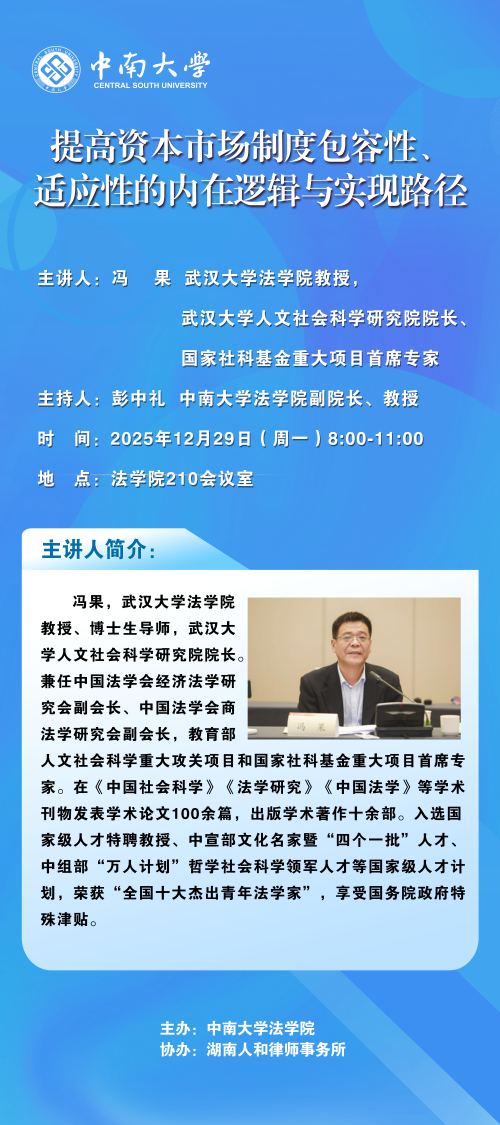 【讲座预告】冯果:提高资本市场制度包容性、适应性的内在逻辑与实现路径