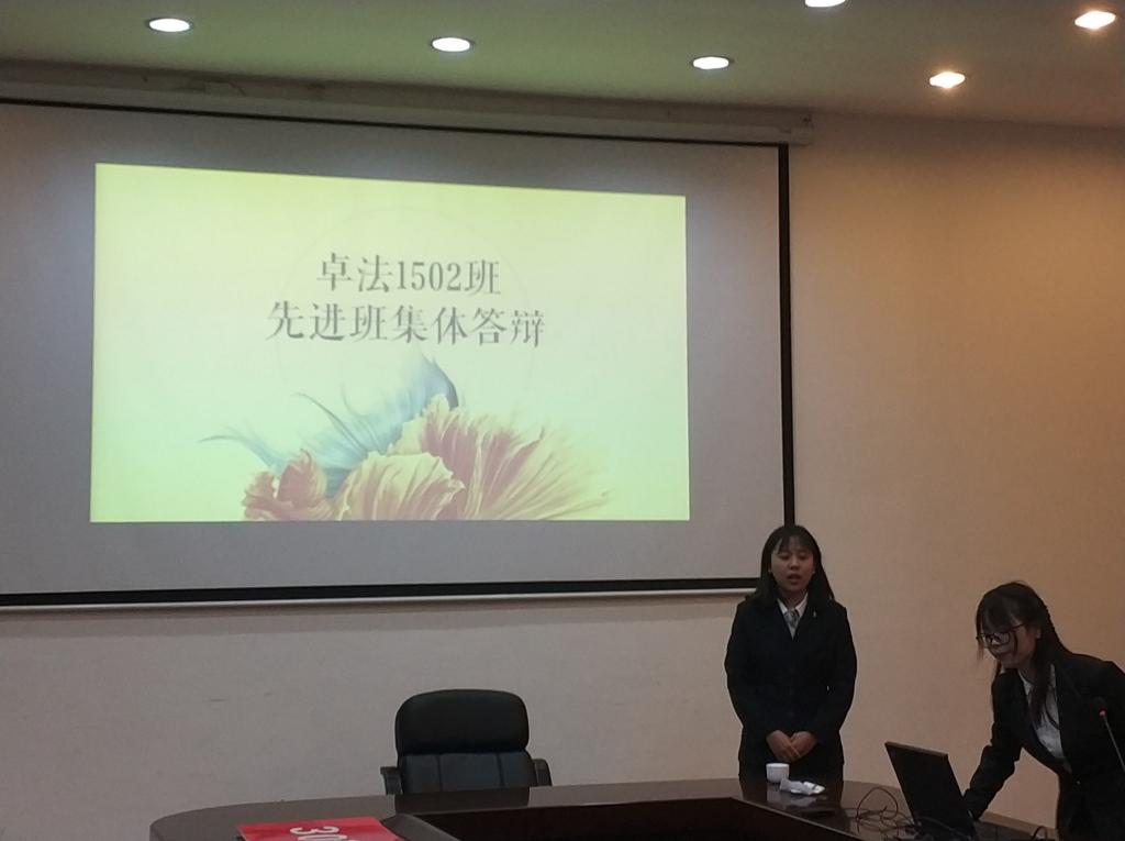 在班级答辩展示环节中,各班代表结合班集体特色,运用PPT、视频、电子杂志等多种形式,分别从班级概况、学风建设、班风建设等方面进行了精彩的阐述。大家的答辩内容异彩纷呈,凸显特色,尽展班级风采,使在座的每一位嘉宾和观众都融入其中。其中,卓法1502班富有仪式感地回顾了大学四年来班级的点滴进步,法学1601班分享了他们班独特的班级理事会制度,将企业管理制度与班级管理制度巧妙结合,令人眼前一亮。