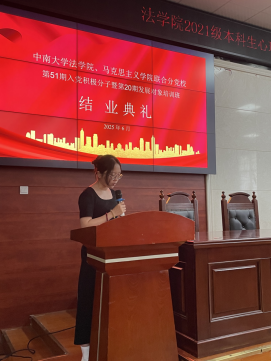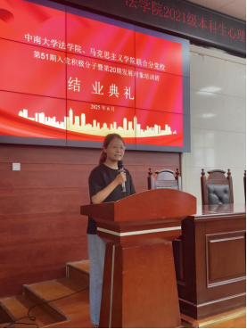 接着入党积极分子代表光炜卿进行发言。她结合在党校学习的心得体会,向同学们诠释了党的正确领导给个人成长发展,国家发展进步做出的重大贡献,同时她指出本次培训是全体学员政治生命的新起点,应以本次学习为终生践行的新开端,以习近平总书记“我将无我,不负人民”的精神境界为标杆,把对党忠诚化作做事创业的实际行动,让青春在建设社会主义现代化国家的征程中绽放绚丽光彩。