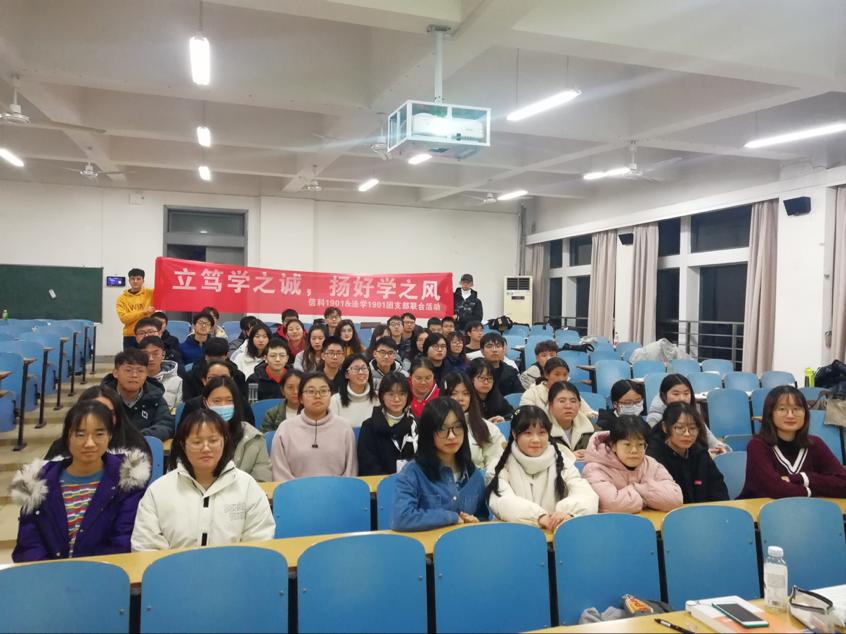 线下活动包括主题班会、集体自习和诚信辩论赛三个部分。12月21日晚上19:00,信科1901与法学1901在新校区教学楼B座117开展了“立笃学之诚,扬好学之风“主题班会。届时信科1901班和法学1901班的全体同学参加班会,班会全程由信科1901班班长杨迪主持。