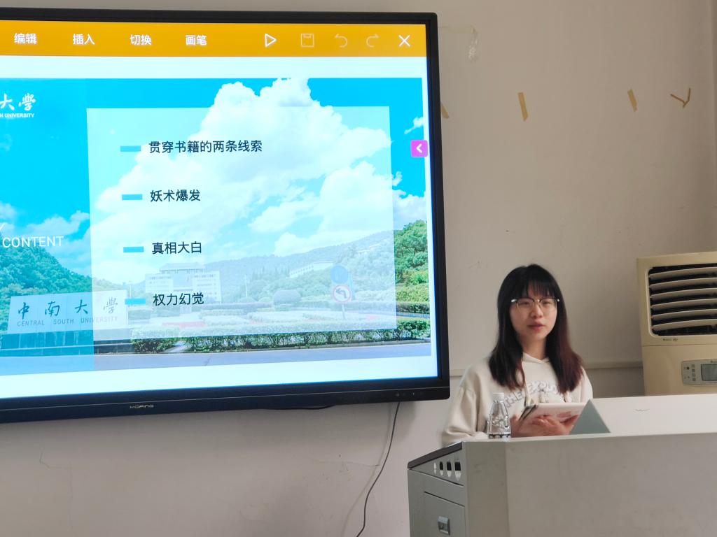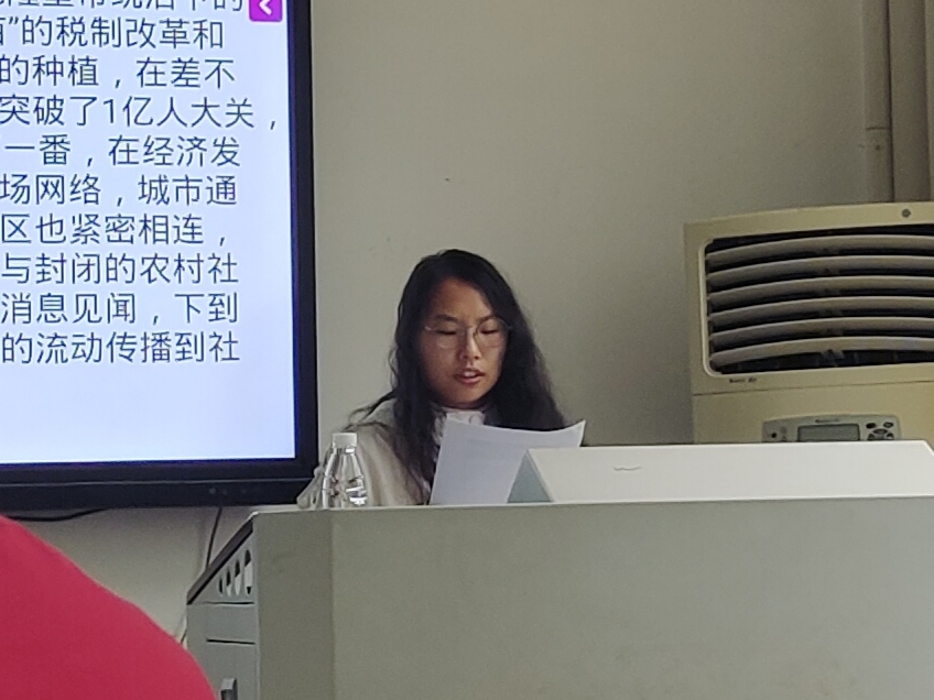 会议分为第一、第二小组展示。第一小组付可馨、赵钧锐、罗宇琦、刘璐璐同学以PPT的形式对《叫魂》一书进行了鞭辟入里的分析。付可馨同学以贯穿全书的线索为主线讲解了《叫魂》一书的主要内容,分析了本书中的主要社会问题、政治问题。