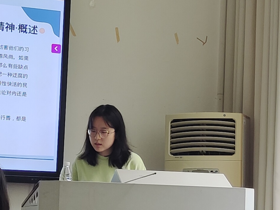 接下来,第二小组同学对《论法的精神》发表了自己的意见和见解。伍晨同学对孟德斯鸠与当时的中国社会之间的关系进行阐述,讲述了孟德斯鸠对晚清人士的影响。刘一衔同学以多个维度讲解了孟德斯鸠笔下的中国“精神”、中国政体与政治。