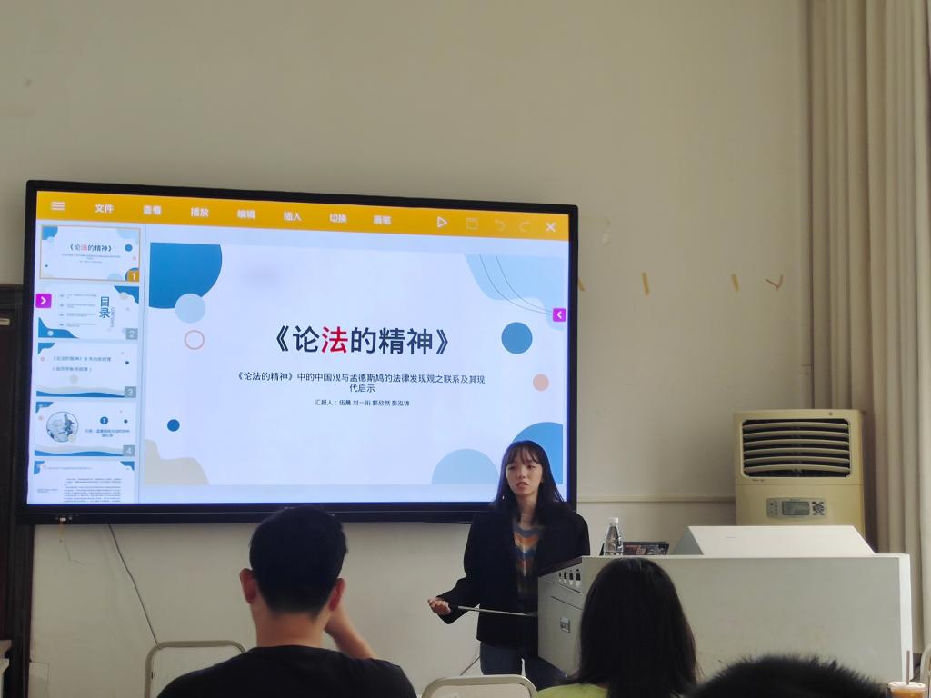 第二小组主要讨论的是孟德斯鸠的中国观,以及其法律法律发现观,在进入该主题之前,首先有一个对全书整体内容的一个梳理,对上下卷分章节讨论中心思想,之后引出本书的主题,孟德斯鸠的中国观与孟德斯鸠的法律发现观之联系及其现代启示。对于主题的讨论,分为四个部分,一是引言,介绍晚清对于孟德斯鸠理论的引进,其次是孟氏笔下的中国政体与政治,借此将孟德斯鸠的政体理论置于中国语境之下论述,第三部分是论述立法与司法意义上的法律发现观,对于前者主要通过对中国精神与中国区位因素的讨论来解释,后者则参照孟氏的论证思路。最后聚焦于孟德斯鸠的中国观的时代性和司法意义上的法律发现观的现代启示。第二小组通过传输孟氏法律发现的现代司法启示总结本次汇报,入木三分,发人深思。小组对本书观点的论述角度新颖独特,论证丰富多样,同学们反应热烈。