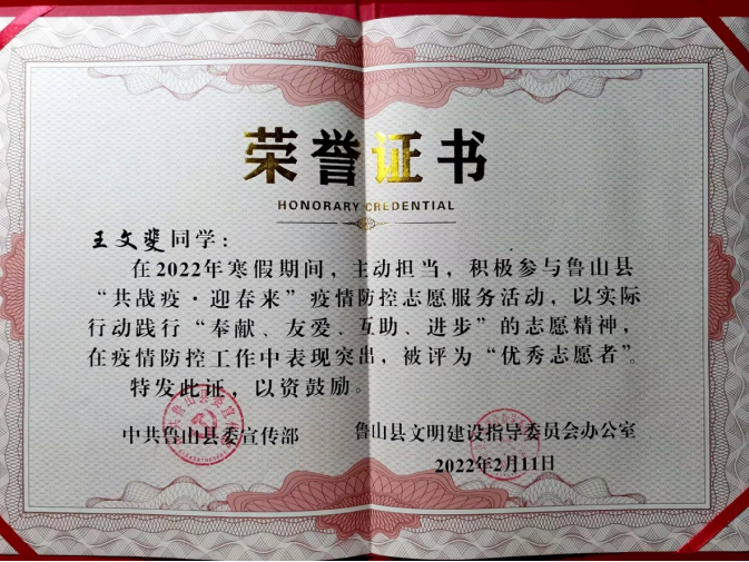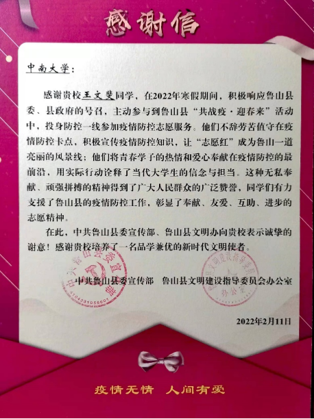 社区是实施网格化管理的基础,是疫情防控的第一道防线。王文斐同志的认真工作得到各部门的一致认可,被评为“优秀志愿者”,中共鲁山县委宣传部也特别向学校发来感谢信。