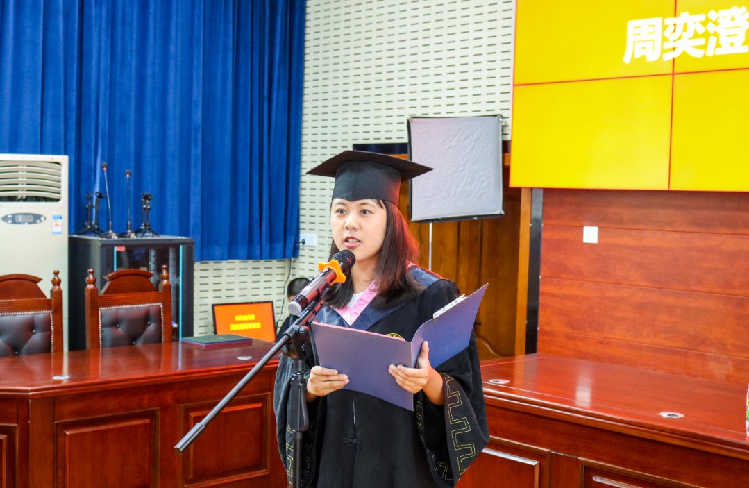 在庄严肃穆的国歌声中,仪式拉开序幕。首先,由陈云良院长为毕业生致辞。陈院长从近期华为公司的相关事件引入,以“一切伟大的背后都是苦难”为题,希望广大毕业生要有家国情怀,为国家奋斗,要有大格局大胸怀,要有战略眼光和忧患意识,要注重人性化关怀,要有开放、法治和民族意识。他祝福广大毕业生们前程万里,成就自己的伟大。