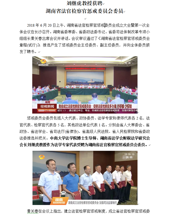 刘继虎教授获聘 湖南省法官检察官惩戒委员会委员