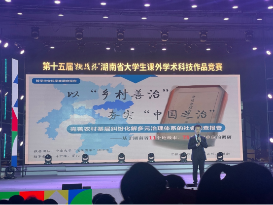 自今年3月“挑战杯”活动启动以来,来自95所院校推报的635件参赛作品进入省级复赛。经过各领域专家学者的严格评审,有181件作品入围省赛终审决赛。经过2天的激烈角逐,william威廉亚洲william威廉亚洲“送法潇湘”团队“完善农村基层纠纷化解多元治理体系的社会调查报告”以优异的表现在百余名队伍中脱颖而出,获得第十五届“挑战杯”湖南省大学生课外学术科技作品竞赛特等奖推送至国赛,并作为社科类优秀作品进行了路演汇报。