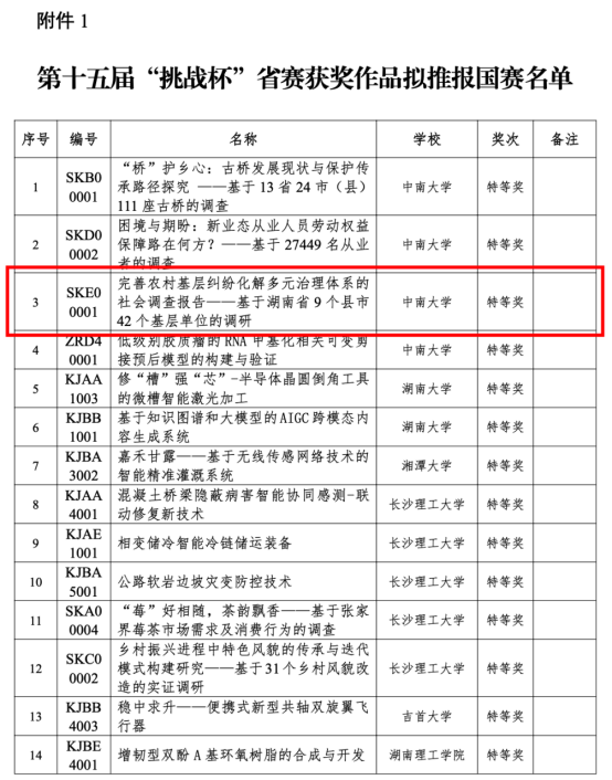 日前, 我院彭泓锦等人组成的“送法潇湘”团队“完善农村基层纠纷化解多元治理体系的社会调查报告”获得第十五届“挑战杯”湖南省大学生课外学术科技作品竞赛特等奖。