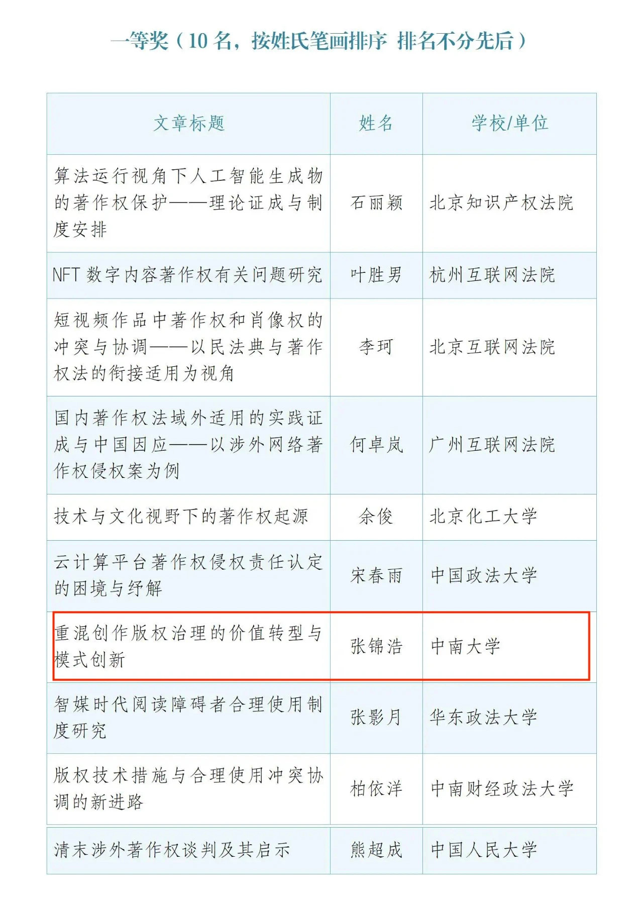 本次活动由中国版权保护中心指导、《中国版权》杂志社主办、中华版权代理有限公司协办。经过宣传、征稿、初审、终审、公示,最终产生一等奖10名、二等奖20名、三等奖30名、组织奖7名。