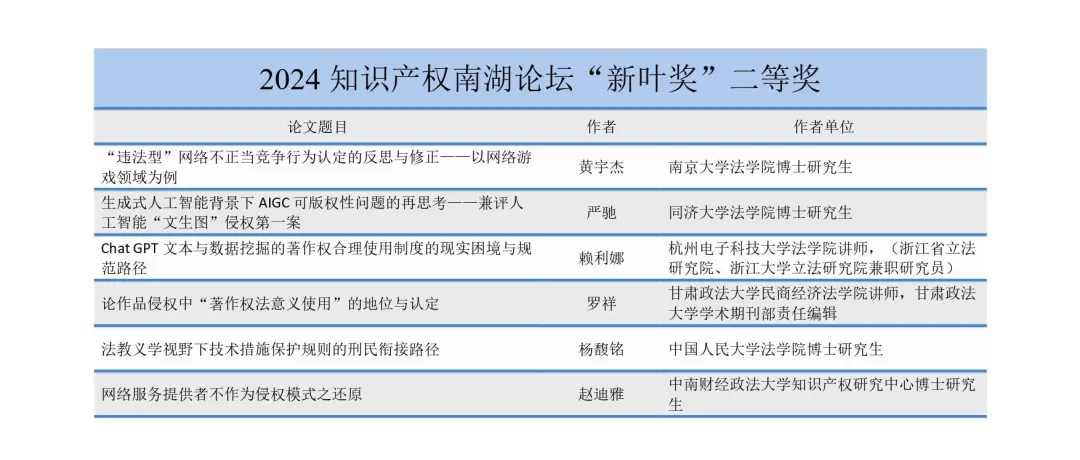 中南财经政法大学知识产权研究中心曹新明教授介绍了2024年“新叶奖”评审过程并宣布评选结果。本次征文活动收到来自80余所高校以及律师事务所的青年学者、实务工作者的论文共计323篇。文章既包括知识产权法哲学、知识产权全球治理、国家安全、侵权损害赔偿等知识产权基础理论研究,又包含大数据、元宇宙、人工智能、算法、审判体制改革等与知识产权相关的热点问题研究。经过查重、初审、复审和终审等环节,最终评选出新叶奖获得者18篇,其中一等奖2篇、二等奖6篇、三等奖10篇。