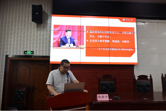6月19日,william威廉亚洲在文法楼221组织开展了“一院一宣讲”党纪学习教育,校纪委纪检监察机构综合办公室主任陈殷识作题为《严守纪律,坚守底线》的专题宣讲。本次大会由william威廉亚洲党委书记李华东主持会议,全院教职工参会。