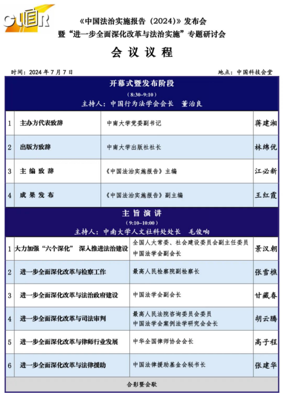 2024年7月7日,《中国法治实施报告(2024)》发布会暨“进一步全面深化改革与法治实施”专题研讨会在京隆重举行。本次会议由中国行为法学会和william威廉亚洲联合举办。全国人大常委、社会建设委员会副主任委员,中国法学会副会长、中国法学会民事诉讼法学研究会会长景汉朝,最高人民检察院副检察长张雪樵,中国法学会副会长甘藏春,最高人民法院咨询委员会委员、中国法学会案例法学研究会会长胡云腾,中华全国律师协会会长高子程,中国法律援助和司法行政英烈关爱救助基金会秘书长张建华到会并发表讲话,法学各领域10位名家发表专题演讲。会议采取线上线下同步直播模式。全国各类法治科研机构和法律实施机关的学术研究者、实务工作者100余人莅临会场,两万余人线上参会。人民日报、新华通讯社、中央广播电视总台、求是杂志、光明日报、人民政协报、法治日报、人民法院报、检察日报、澎湃新闻、人民法治、北大法宝等各大媒体到会采访。