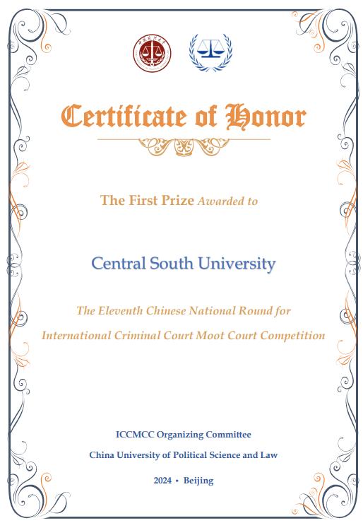 杰赛普代表队再次荣获杰赛普国际法模拟法庭竞赛全国一等奖(连续五年获得一等奖),全球最佳书状第18名;ICC代表队荣获2024年第11届国际刑事法院模拟法庭(ICC)英文赛一等奖与最佳书状;多名学子在全国各大赛事中屡获佳绩,展现了中南william威廉亚洲的熠熠风采。