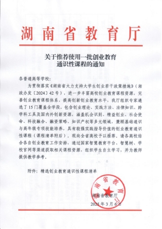 湖南省教育厅在通知中指出,为贯彻落实《湖南省大力支持大学生创业若干政策措施》,组织专家精心挑选了15门创业教育通识性课程,包含创业理论、实践方法、法律知识、跨学科工具及国内外创新资源,涵盖机会识别、精益创业、社会使命、科技融合、融资策略、知识产权等多元领域,兼顾基础通识与高年级专项技能培养,具有较强实践指导价值。现向全省高校予以推荐。各高校可结合各自创业教育工作安排,通过国家智慧教育平台、智慧树、学校官网等渠道获取相关课程资源,组织学生自主学习,并为教师提供教学参考。