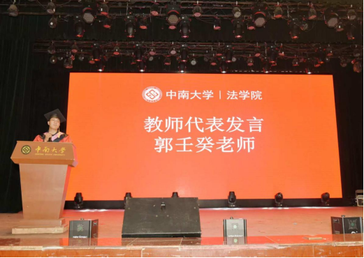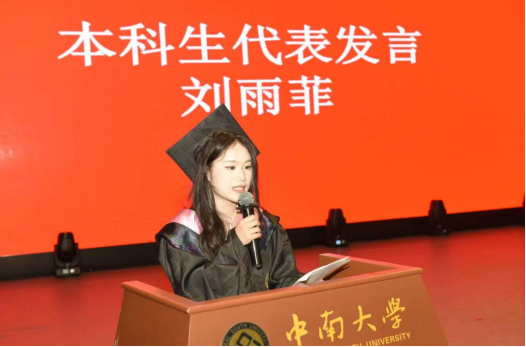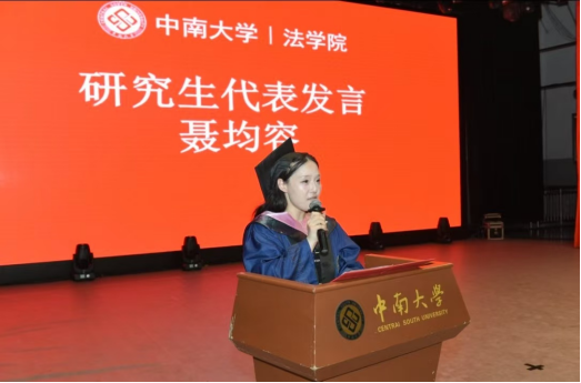 作为研究生代表的聂均容同学回顾了在校期间的成长经历,感恩母校提供的优良环境与悉心教导。她表示在中国法治建设的黄金时代,会始终牢记法律人的初心,以中南法学人特有的坚韧与智慧,在每一个需要法治光芒的地方,做忠实的燃灯者。