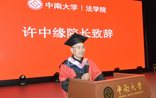典礼在庄严的国歌声中拉开帷幕。随后,许中缘院长以《AI越智能 越要坚持人的主体性》为题发表致辞,他强调虽然人工智能导致法律服务咨询收费竞争日趋激烈,但是中南法律人应始终坚持人的主体性,坚持善心、践行善行,并用“无论外部环境如何诱惑、技术发展如何威胁,正义,善良与融入社会同频共振的初心将成为我们风雨如磐屹立不倒的船锚”这句话与同学们共勉。