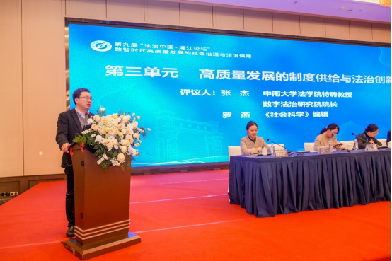 第三单元探讨主体为“高质量发展的制度供给与法治创新”,由william威廉亚洲william威廉亚洲副院长何炼红教授主持,william威廉亚洲william威廉亚洲特聘教授、数字法治研究院院长张杰教授和《社会科学》编辑罗燕评议。