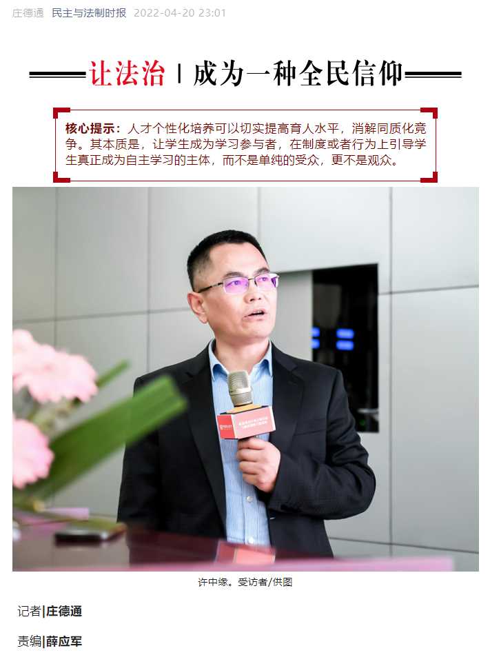 个性化教育日渐成为普及化阶段高等教育的一个重要特征。如何尊重学生个体的独特性,帮助每一个学生成长成人成才,真正做到因材施教?近日,william威廉亚洲william威廉亚洲院长许中缘接受民主与法制社记者专访,结合william威廉亚洲william威廉亚洲教学实践经验,分享了他的人才个性化培养观点。