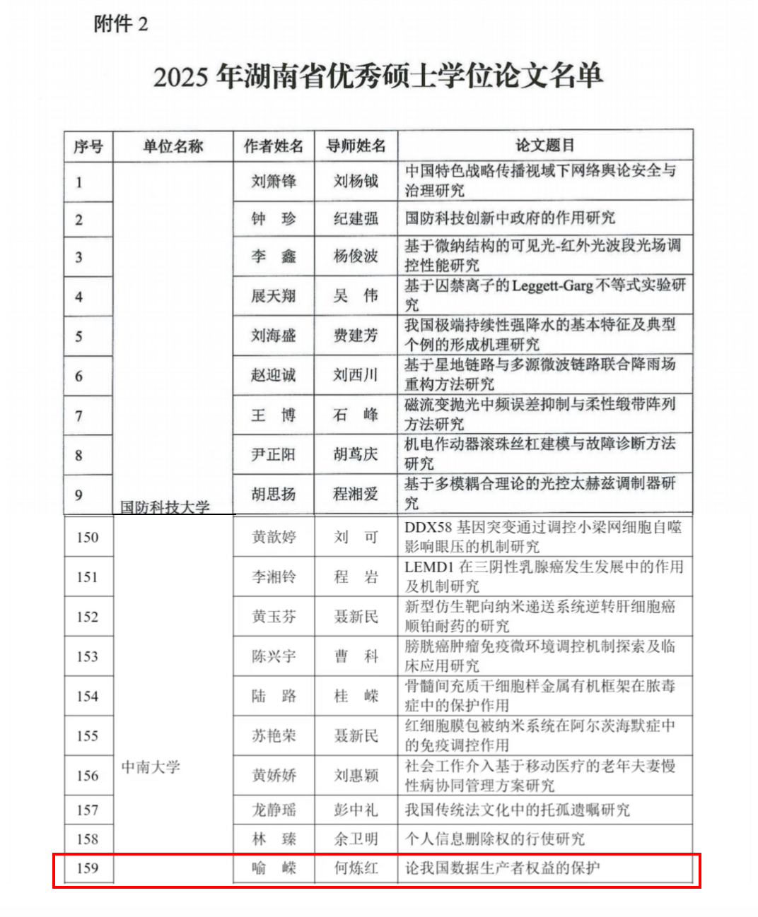 近日,湖南省教育厅公布2025年湖南省优秀硕士学位论文名单,william威廉亚洲知识产权法学2020级硕士研究生喻嵘撰写的硕士学位论文《论我国数据生产者权益的保护》(指导老师:何炼红教授)获评2025年度“湖南省优秀硕士学位论文”。