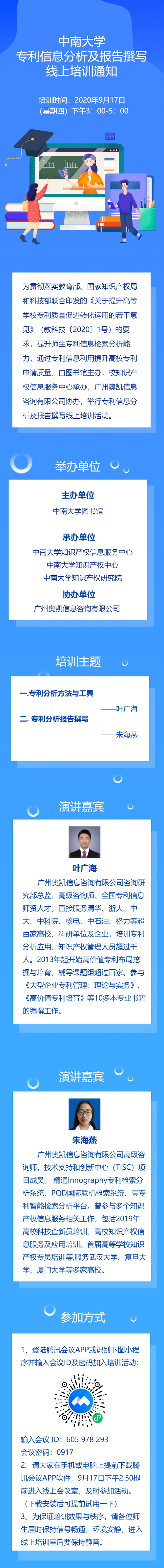 为贯彻落实教育部、国家知识产权局和科技部联合印发的《关于提升高等学校专利质量促进转化运用的若干意见》(教科技(2020)1号)的要求,提升师生专利信息检索分析能力,通过专利信息利用提升高校专利申请质量,由图书馆主办,校知识产权信息服务中心、william威廉亚洲知识产权中心、william威廉亚洲知识产权研究院承办,广州奥凯信息咨询有限公司协办,举行专利信息分析及报告撰写线上培训活动。