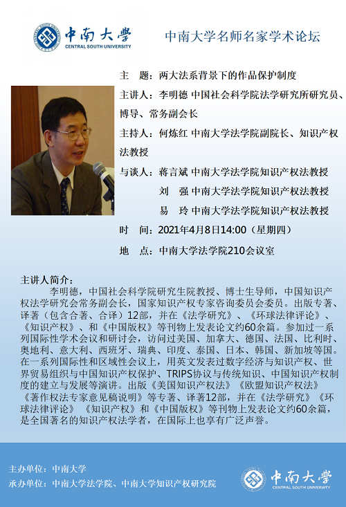 讲座预告 | 李明德:两大法系背景下的作品保护制度